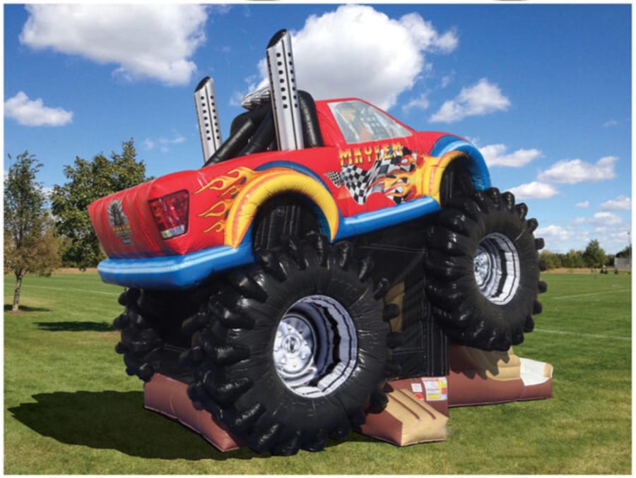 Inflatable monster trucks. It features vivid digital printing, realistic tires, a large bounce area, a climbing wall and a slide. It is dry compatible.