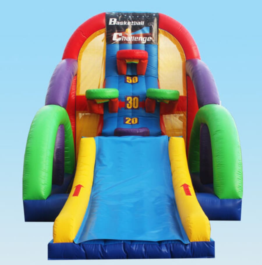 This fast-paced competitive Shooting Stars inflatable game will have participants offering up their best shots, in this dueling basketball game unlike any other. Each player can engage in a crossover shooting action as they try to make baskets, and as the ball return from each shot makes it to the opponent's lane, the first player to get rid of all their basketballs rules this inflatable court. This spirited inflatable game features full basketball court imaging, along with three-dimensional players and basketballs, sure to attract plenty of future NBA stars! The Shooting Stars inflatable game is a great way to promote exercise, healthy competition and sportsmanship, and is a fun addition to any birthday party or event for guests of any age. Part of an interactive line this inflatable basketball shooter game will attract players to any outdoor event or Family