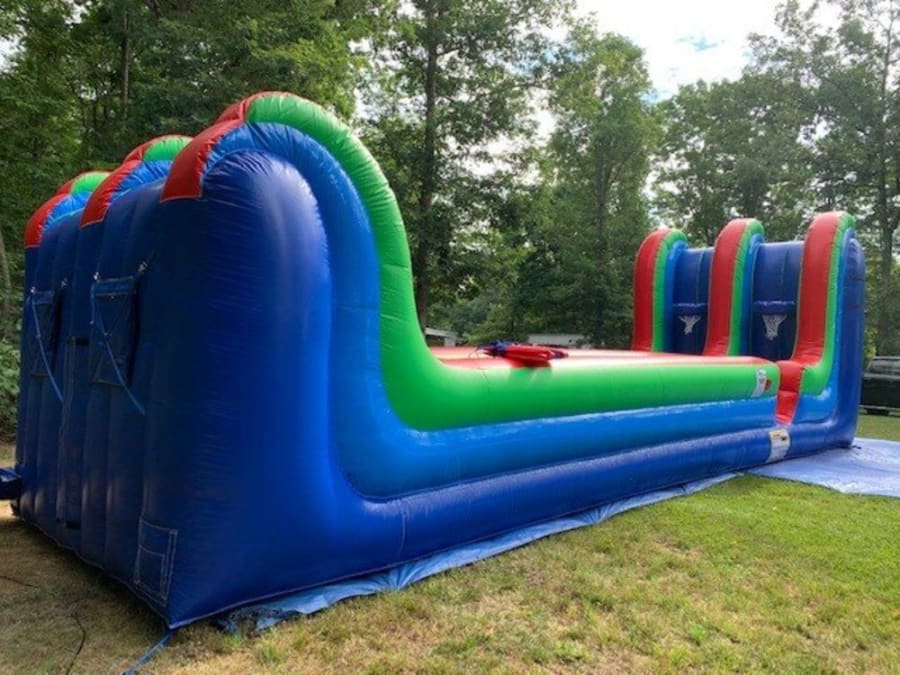 The two-lane inflatable basketball will keep your guests moving. The object of the game is to put on the vest which is attached by a strong elastic rope, then see how strong it is by running through Bungee Run and trying to make a basket with the basketball and finally being pulled back like a rubber band to the point of departure. This is a great challenging inflatable activity, order yours now!
