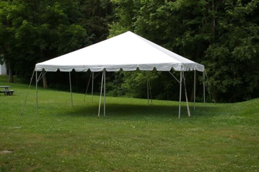 Our 20 x 20 full frame tent is an ideal tent for someone with a small backyard. It can seat 40 people; 5 round or rectangular tables. 1 rectangular buffet, Our frame tents are the best in the business, NO ROPES, NO WIRES, NO POLES in the middle. They are adjustable from a 6 foot to 10 foot head height and are open and clear on the inside. the walls are rented separately call for your cost. Installation on grass on your own private property is preferred.