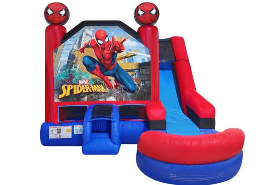 SPIDER MAN 6-in-1 This wet or dry combo ride features six different inflatable activities: (1) a larger bounce area; (2) a basketball hoop; (3) inflated thrust, obstacle pop-ups; (4) a wallcreeper; (5) a "high deck" wet or dry slide; and (6) a removable pool/landing area for wet use. It is more likely to be rented as it can be rented as a normal dry combo or as a water slide. woo hoo
