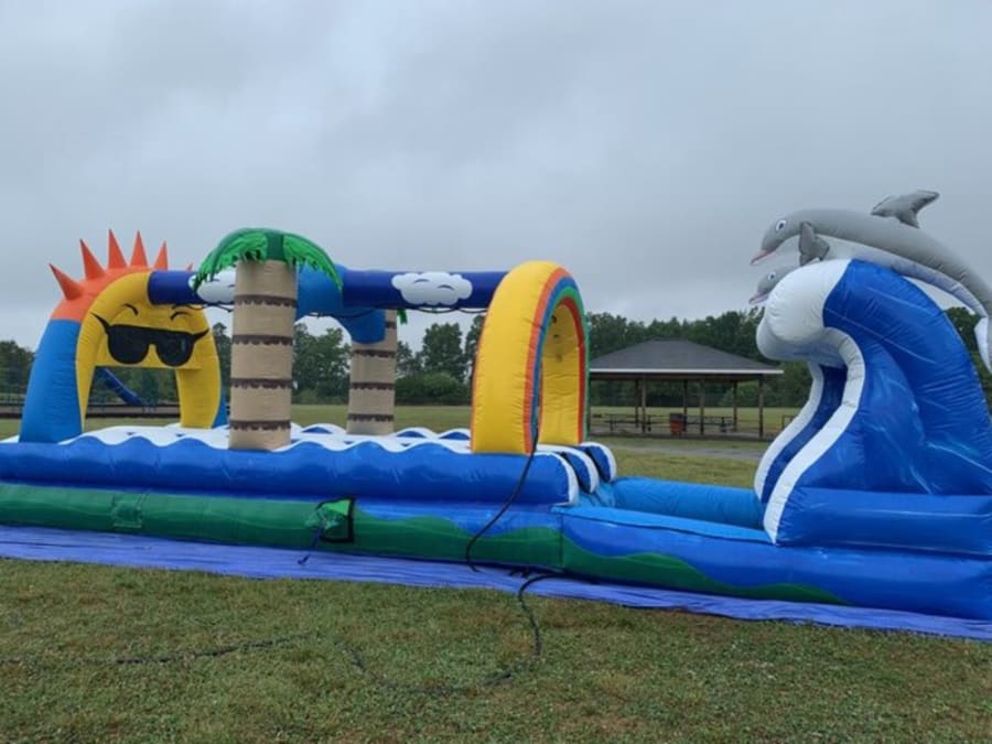 completely wet slides perfect for any summer party or to bring a little sunshine to any celebration! Participants start a race to slide down the fast slide and then go down into a pool of water. A friendly green, orange and yellow color theme allows Summer Splash to fit in with any décor and is sure to be an eye-catching addition to any party.