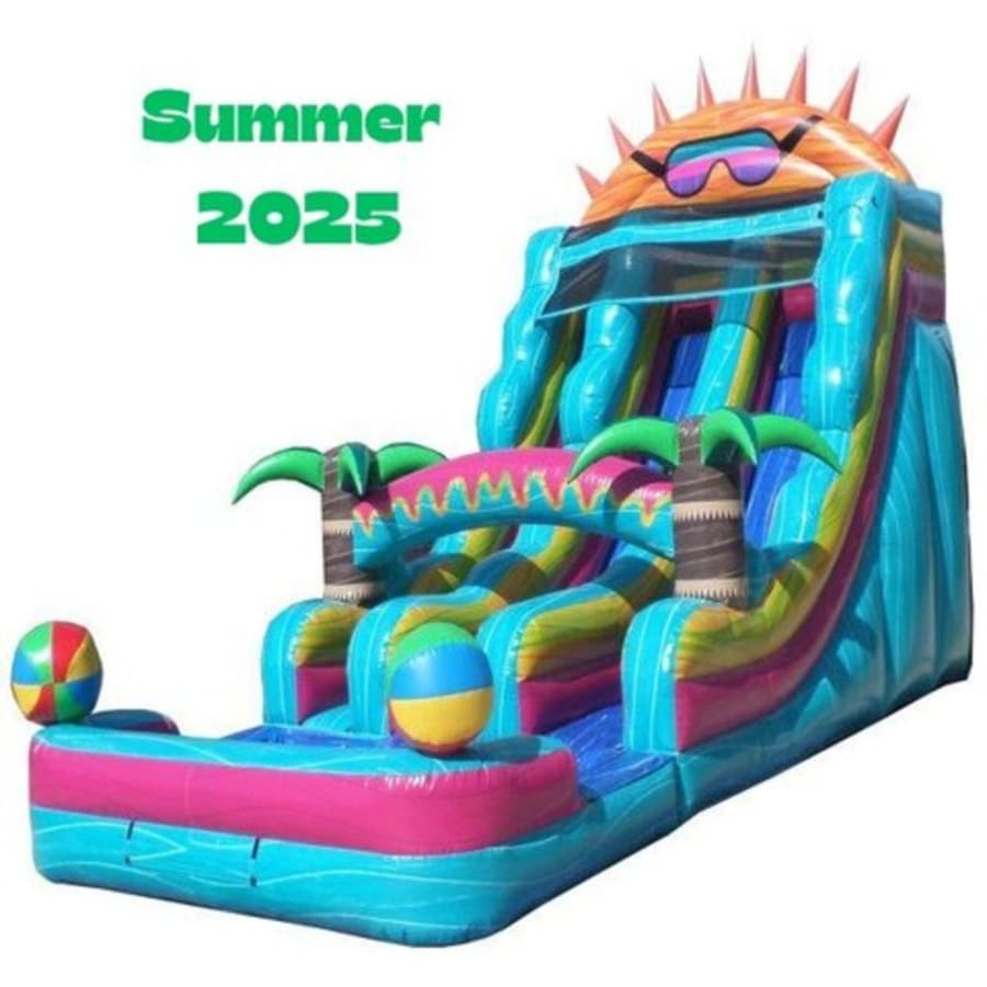 The Summer Splash water slide is the perfect addition to any summer party or to add a touch of sunshine to any celebration. Participants ride a fast-paced slide and then glide into a pool of water. Its fun tropical color theme of orange, yellow, blue, and red allows Summer Splash to fit into any decor and is sure to be an eye-catching addition to any family party, gathering, graduation, church, or social event.